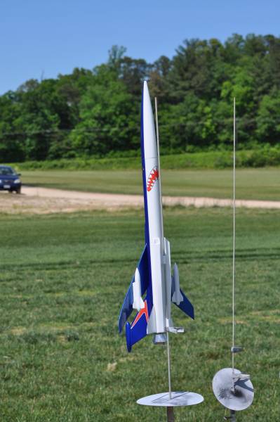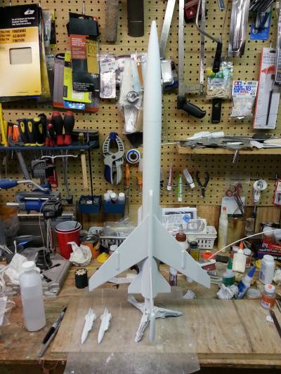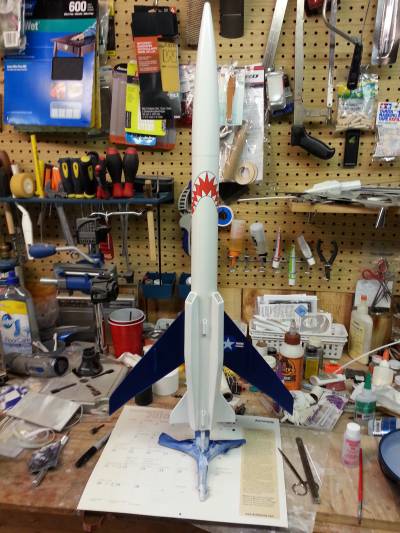The missiles and aft skirt were CA'd on as the final touches are underway. I clear coated the missiles with Krylon satin as glossy missiles seemed inappropriate. The aft skirt was painted with Rustoleum chrome.