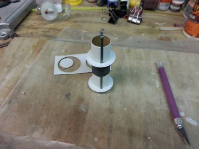 I'm not a big fan of the Estes shock cord mount although they do work perfectly well in most circumstances. I opted to install a BT-60 baffle(not included) which is constructed with a BT-60 coupler and two plywood centering rings with holes drilled in a pattern that will allow pressure to move through the fuselage at ejection without the need for wadding. I painted the blast surfaces with epoxy to protect the wood and installed a screw eye for the shock cord.