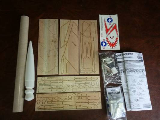 The Conquest is the new skill level 5 kit from Estes. It is a BT-60 sized winged rocket that stands 28.6" tall with a wingspan of 12.8". It's suggested engines are the D12-3, E9-4 and the E12-4 with a projected max altitude of 1100 ft. We'll see about that. I love winged rockets and this looks to be an interesting build.