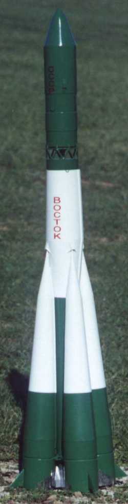 This model is a HPR 1/35 scale model of the Vostok launcher used to put the first man, Yuri Gagarin, in orbit in 1961. The model is powered by a H242 reloadable motor and recovers in two pieces via parachutes