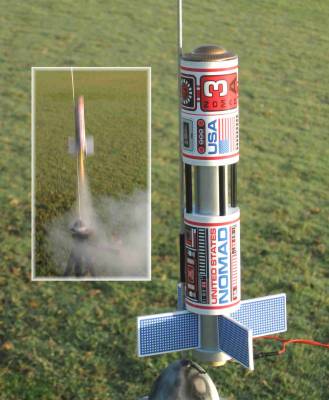 New kit from Custom. Looks a little like a shortened Centuri Skylab with it's solar panel fins. Harder to build correctly than you'd think, a good display model. Flat vacuformed nose cone cap.