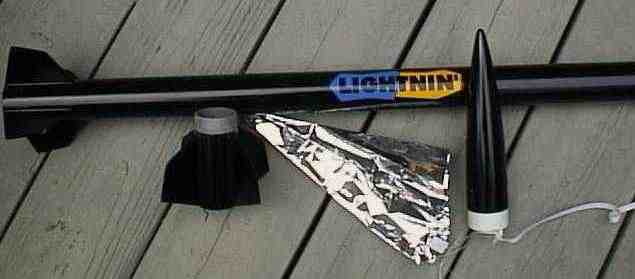 Lightnin'is a two-stage, D-powered rocket. The rocket is 46" tall and 1.637" in diameter. It uses a plastic nose cone and balsa fins. It uses a plastic nose cone and balsa fins. Both 24mm motor mounts have motor hooks. There are two couplers to allow the booster to connect to the sustainer and another to connect the two sections of the main body tube. An elastic shock cord and a 18" metallic mylar parachute make up the recovery system. There is also a single water-transfer decal sporting the name Lightin' in black, purple and yellow.