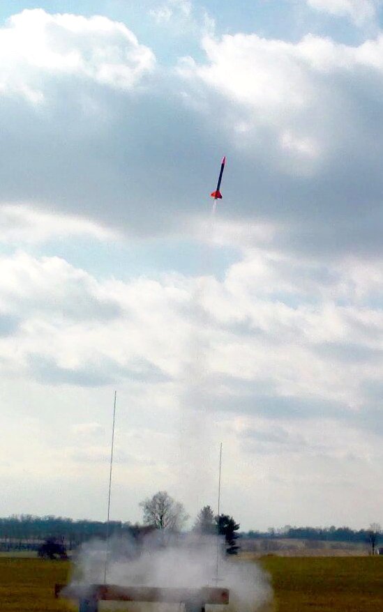 This windy day was no good for high flights or precious rockets, so I sent this RTF model up with an altimeter on a small A8-3 motor to get some new data on it's flight abilities. The molded launch lug is a bit loose for a 1/8" rod, so it wobbled quite a bit after ignition while on the rail. It burned for 6/10 second, accelerated at 13 Gs and averaged 5.6 Gs for the burn. In that time it reached 68mph and 216 feet apogee. The supplied thick and short plastic streamer did not fully release or even leave the tube completely in the 40-degree weather so it came down fast. The wadding was still stuck in the tube - a bit too tight. Still, safe recovery and ready for more flying. Ejection was at 202 feet and it descended at 13 mph for a total flight of 13.1 seconds.