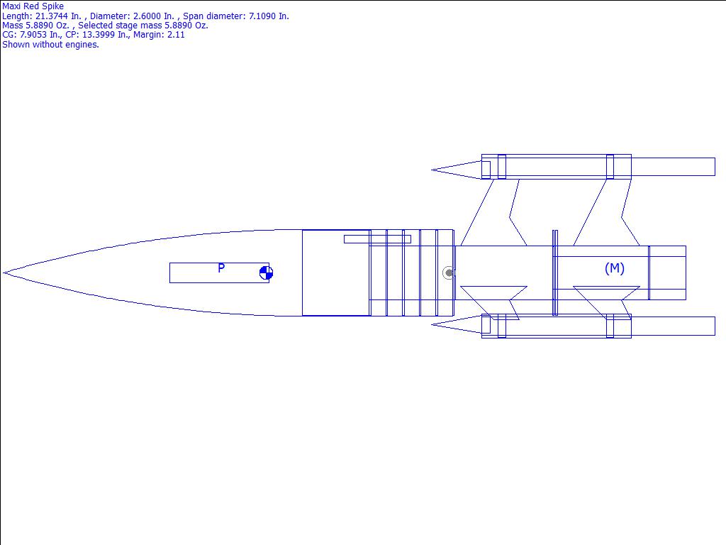 This rocket is sized for 24mm engines and simmed to fly to 230’ on a C-11 engine and to 655’ on a D-12. I decided to try out the stability on the C-11 first. On launch, the Red Spike arced over a little (maybe a little nose-heavy) but stayed stable and the parachute ejected ... [More]