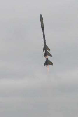 3 stage rocket styled after the Farside-X but using gap staging and engine hooks and a lengthen body tube. Fines are smaller owing to a longer rocket