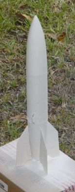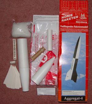 This is the Das Modell Aggregat-4 (A-4) Peenemünde V2. It is designed by Thorwald Peterson of Noris Raketen's Das Modell in Nürnburg, Germany. It is a single-stage Skill Level 3 rocket kit that is not available for sale in the United States. I imported it from a hobby shop in Great Britain several years ago, along with the Saturn V, Space Shuttle and Phoenix kits. The finished V2 model stands at 16" tall. The A4 V2 is a semi-scale model based on the Von Braun vengeance weapon Peenemünde circa 1942.