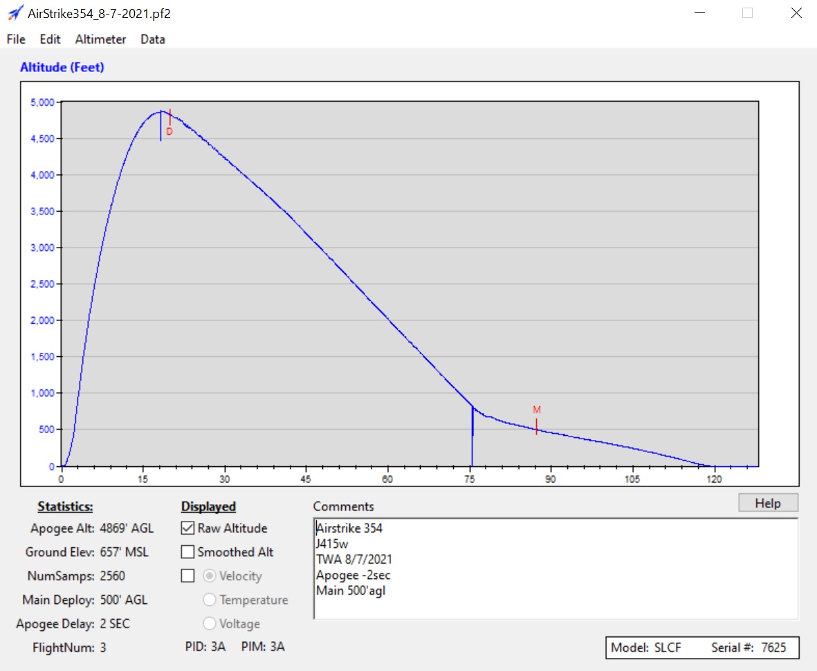 First flight for the Airstrike 354. Unusually calm day at Bong, maybe 2-3mph winds.  The J415 propelled the 3" rocket straight up, getting just under the estimated 5100'  The rocket performed perfectly, landing under main about 900' down wind.  Easy recovery right off the path.