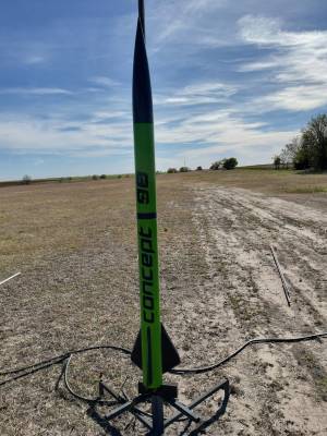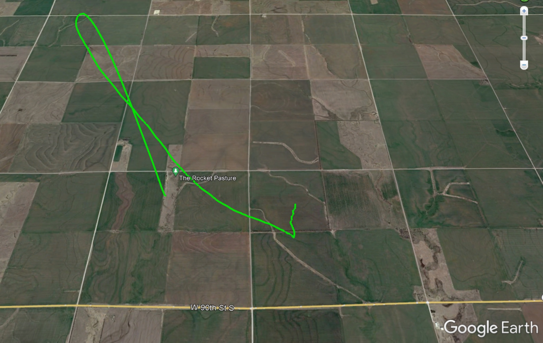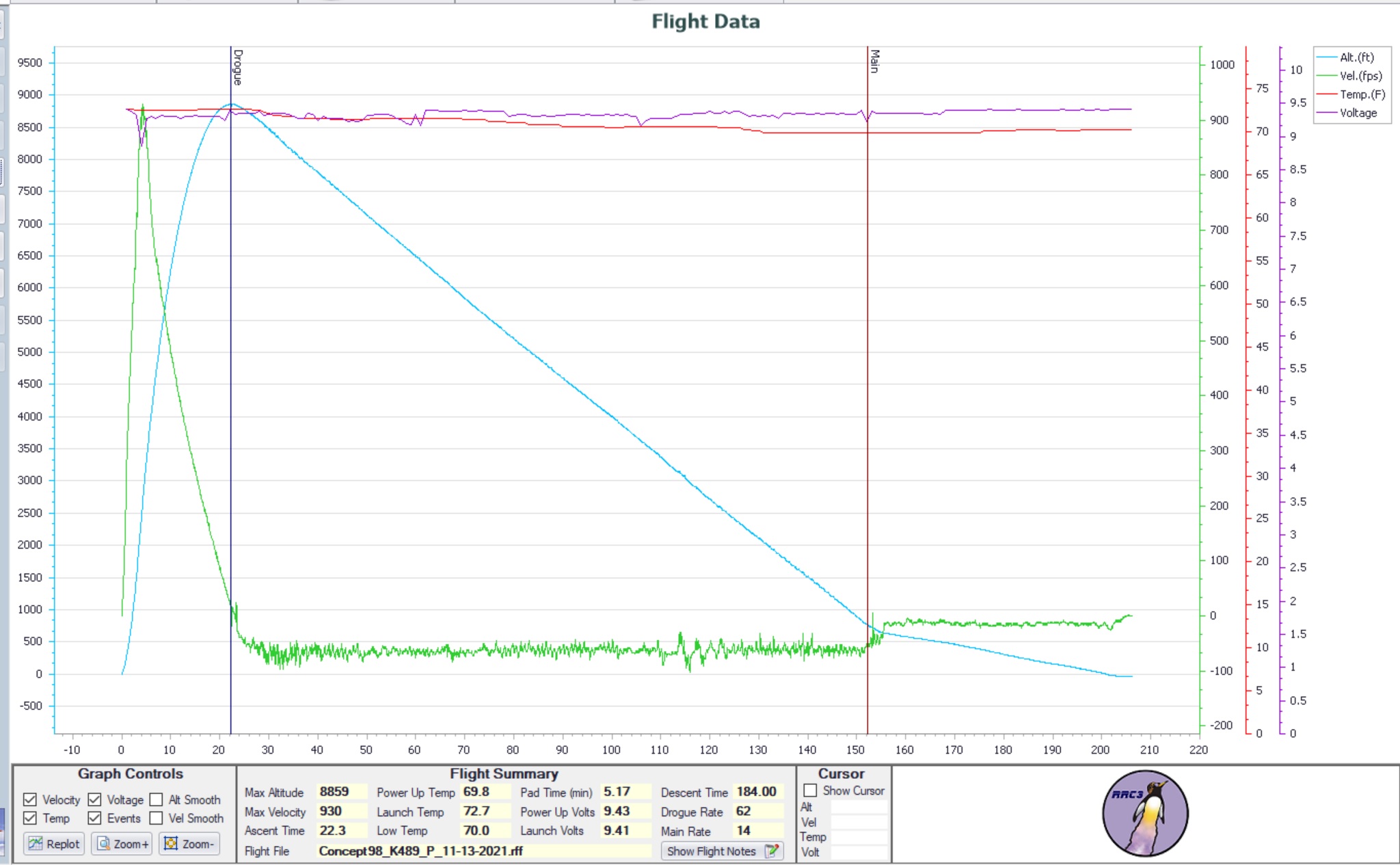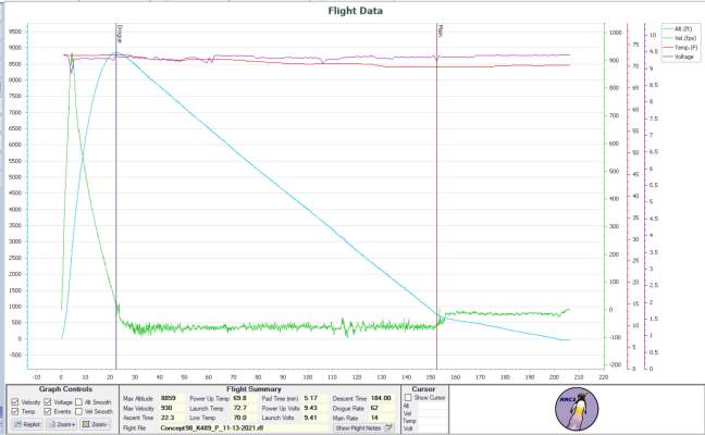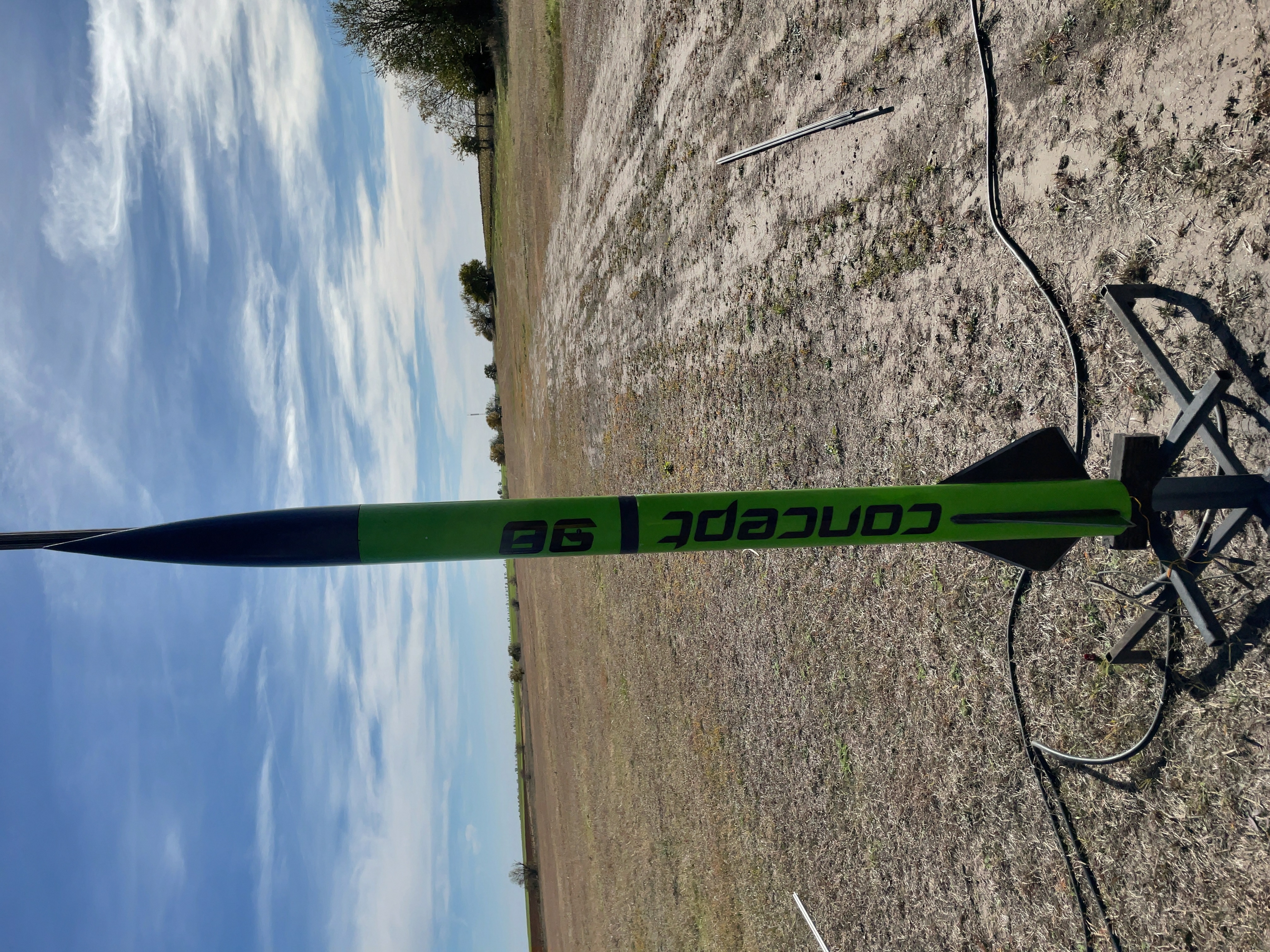 Light winds at The Rocket Pasture and clear November skies. SIM predicted 7424' apogee. Actual apogee average 8878' between the two altimeters. Predicted 850fps velocity, reported 930fps actual. So the rocket overperformed significantly against the SIM. Note that this is the Mark ii version of the rocket with beveled fins so that probably accounts for the performance over the original rocket.