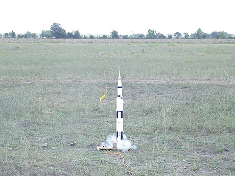 First flight for this highly modified classic model. Used the Quest Q2G2 igniters and the QuickBurst NOVA Launch Controller for launch. Excellent flight; some major damage to the Apollo CM/SM LES section but can (and will) be repaired & flown again.