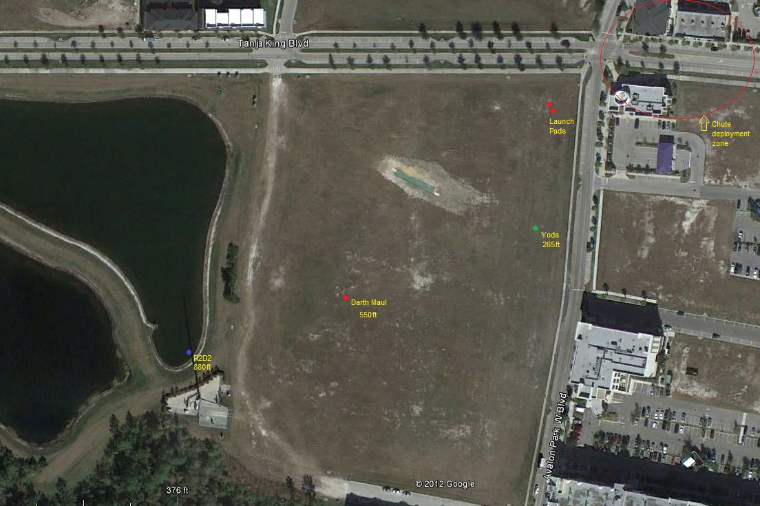 This was part of a triple launch along with Jeff's Estes RTF models Patriarch(R2D2) and Loadstar(Darth Maul). My launch pad hosted R2D2 and Skytrax (Yoda) with a staggered start position while Jeff's 1980's launchpad dutifully handled Darth Maul. There was a slight delay on Maul getting off the pad but they all launched within .5sec of each other. Yoda had a quick descent from a couple detached shroud lines once again, no harm came of the hard landing. Darth Maul and R2D2 were recovered successfully.