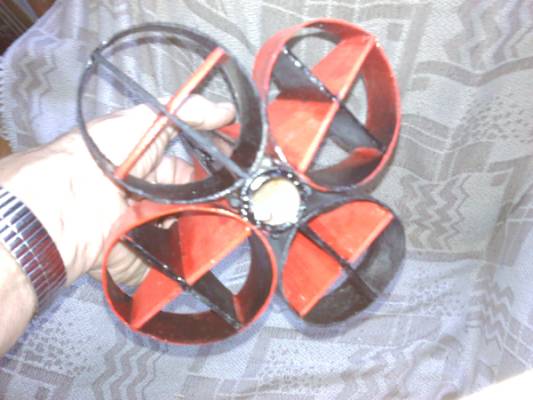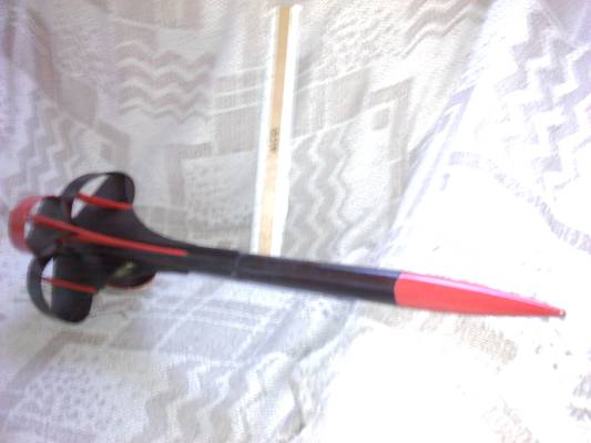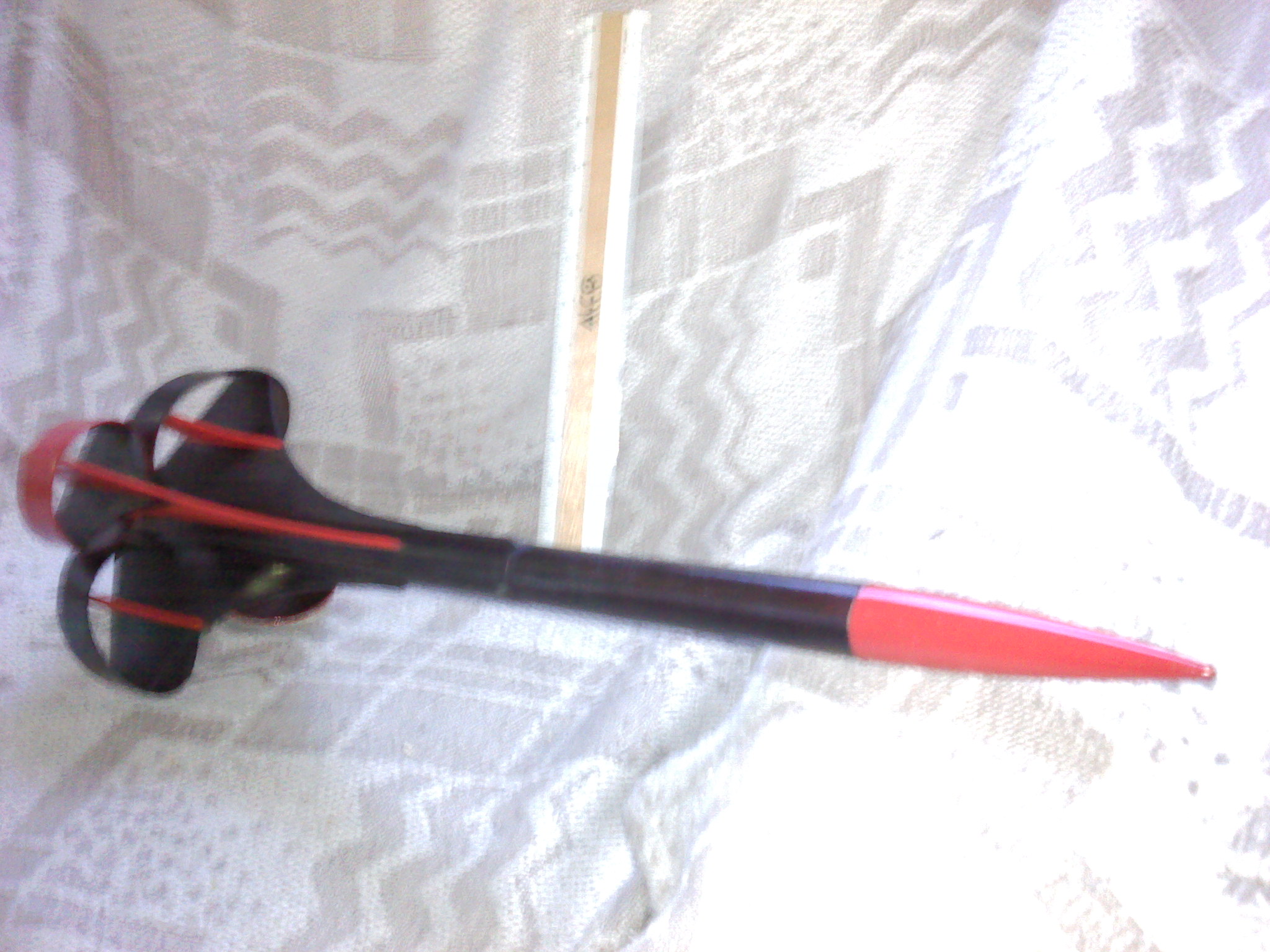 BT-50 body tube w/ four standard fin/slanted tube fin subassemblies; subassemblies are slanted BT-80 sections, within each are a large swept-back fin and set of two smaller crosshair fins; black & red. 3 successful flights as of 2/3/11.