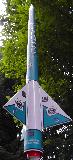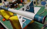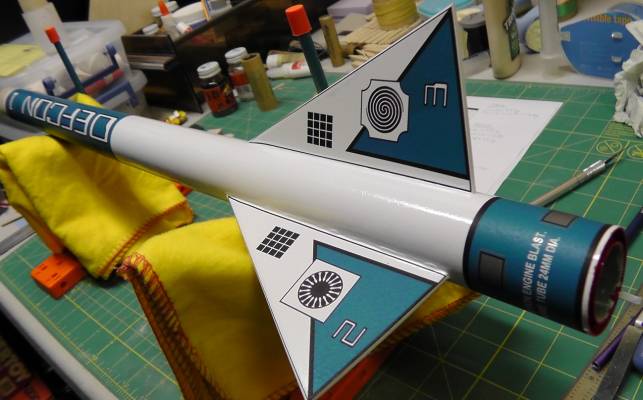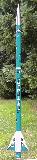 This tall kit is originally supplied with a single long body tube. Since it was damaged in shipping, I cut out the crushed section and spliced together two smaller tubes by making a long, 10" payload section out of the upper third. These tubes had to be sized exactly as the original, because the supplied full-body wrap decals needed to be used. This kit came with a lot of high quality parts, including a foil-lined motor tube, a parachute swivel, cloth-covered shock cord, matching aqua-colored heavy plastic parachute and of course all those decals. It takes 24mm D and E engines. I added an ejection baffle to this rocket.