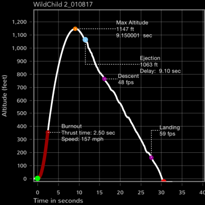 Great boost, nearly straight up.  Delay seemed long.  Descent started out great with the JLCR set at 200 feet.  Unfortunately, I must have accidentally shut it off or failed to turn it on.  I made four attempts to wrap the chute in a manner that allowed the bundle to slide in and out of the BT.  Each time I had to manually open the CR in order to refold the chute.  Need to work on the 38mm packing at the pad.  In contrast, the previous launch of the JLCR in WildChild1 was prepped at home prior to heading out to the home pad.  Today's launch resulted in three cracked fin fillets.