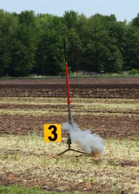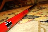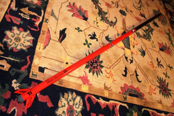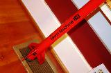 My modified Estes Mean Machine. Built with 3 fins, extended to 88" long, with a 29mm motor mount using an Estes plastic motor retainer. Split two-piece recovery, with a baffle as a mid-tube coupler. The nose is under a 12" parachute, and the lower section under a Red Max skull/crossbones 18" chute. Painted red & black inspired by the Der Red Max, using a combination of Red Max and Mean Machine decals.