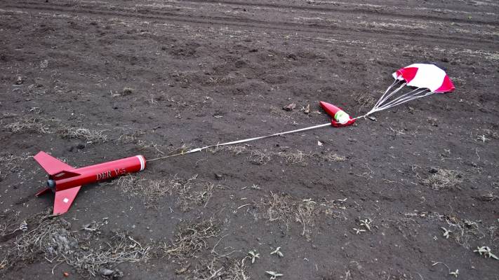 What we've got here is a 4" upscale of the Estes Der V-3. Built with LOC heavy wall tubing, a nose cone from Apogee, and 1/4" birch ply fins. The motor mount is 29mm, with a plastic Estes retainer, and the parachute is a 45" Top Flight. This will used for a Level-1 certification flight, assuming it proves to fly well.
