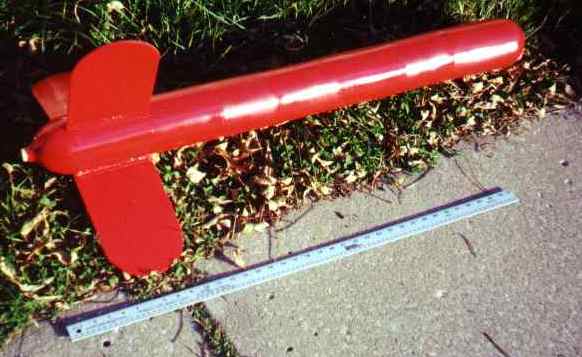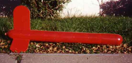 After seeing several small rockets fly out of sight, I wanted a rocket that would spend more time where I could see it. I wanted something large, so it would be highly visible, but with low enough power for a slow, majestic lift-off. Body tubes and nose cones get expensive rather quickly when you go beyond a BT-80, so I looked for a cheaper alternative. I thought of using a 2- liter pop bottle for a body tube, and realized it would also make a neat boat-tail. I was lucky enough to have a friend who found an old 2- liter in his basement with a rounded bottom-- the kind that sat in a plastic cup for stability. This allowed me to give my rocket a rounded, torpedo-like nose.