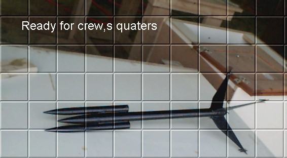 Cut eight 1" lengths of Dowel and round off the tips...these are your pulse cannons:)  Glue them to either side of the fin tip.