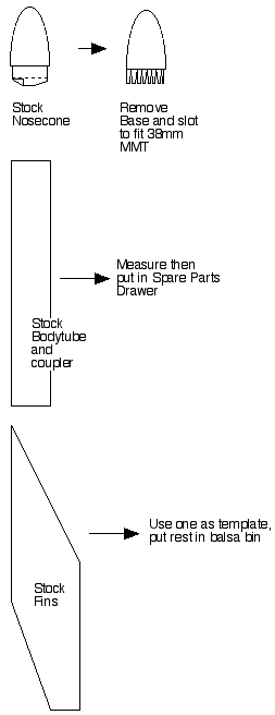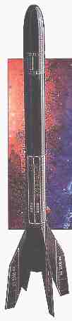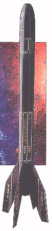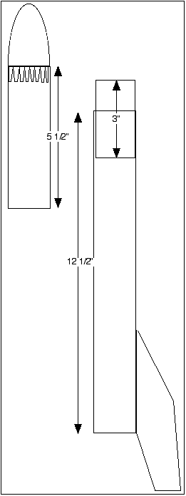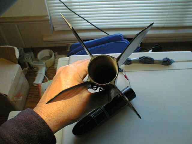 1. First decide how you intend to retain the bridle in the nosecone. My rocket had a length of 1/8" aircraft cable settled into ounce or two of epoxy and bb's with a loop at the aft end. This has to be strong because on more energetic motors the velocities at ejection are going to be fairly high. Make an allowance so that this retention point is accessible when the rocket is finally assembled. 2. Decide where the coupler is going to be placed in the rocket. It's not really critical but it should slightly forward of the longest motor you intend to fly this rocket on. I was going to fly it on an AeroTech 38 mm I motor but decided I didn't want to risk losing this case, I felt I could probably get the rocket back from an H motor flight but not an I. As it is, the aft end of the coupler is 10.5" from the aft end of the rocket. This allows me to use an AeroTech 480 Ns 38 mm case if I feel _really_ lucky. Split the body tube accordingly so that half the coupler is aft of the split and half is forward. 2.a. If you choose to fly this on an H125 29 mm motor (or any long 29 mm motor) the location of the coupler is moot as long as the method of retaining the nosecone and upper airframe will still clear the motor. The 29 to 38 mm adapter should center the motor within the rocket adequately but if you feel uncomfortable, tape an additional 29 mm to 38 mm centering ring on the forward part of the motor just aft of the coupler. Use tape to thicken the motor case OD so the ring fits nicely. 3. Decide how you want to provide aft retention for the bridle. Since this rocket is going to go high and fast, a robust method must be provided. Aircraft cable threaded through the coupler is a good one, a couple of loops of unwaxed braided Kevlar epoxied to the inside of the coupler would work as well. These aft retention points can be smaller as long as two separate distinct points are provided for attachment. 4. Cut the base base of the shoulder from a stock Estes BT-60 Big Bertha style nosecone. Slot the shoulder so it will slide into the LOC 38 mm motor tube. With a Dremel, cut off the base and cut the remaining plastic shoulder into tines or teeth. See image here. 5. Install nosecone retention into nosecone, install epoxy and bb mass and allow to cure. Epoxy nosecone into the upper section of body tube. 6. Using the stock Big Bertha fin as a template, lay out 4 fins on a piece of .043 G10 fiberglass. G10 is available from various sources on the internet (BMS, Vaughn Bros, etc.) or it can be found at Radio Shack or Fry's Electronics as copper clad material for printed circuit board. 1/8" aircraft plywood can be substituted as well but should be glassed completely if Bertha goes supersonic. I used G10 so the directions will be for this material. Use tinsnips or heavy-duty scissors to cut the G10, in this thickness it cuts very cleanly and easily with a pair of compound snips. Stack and sand all the parts so they match. 7. Divide the body tube into quadrants and draw lines for fin installation. Use your Dremel to remove the glassine layer from the LOC tubing prior to bonding. Rough up the root edge of the G10 fins to promote bonding, about 1/4" up the span or so. Tack fins to body tube using thick CA or 5 minute epoxy in only 2 or 3 places and allow to dry. Mix up a sufficient batch of epoxy to fillet all the fins, moisten the fillet area with unmodified epoxy to prevent a resin starved joint. In other words, use your fingertip to smear some epoxy into the paper tube - just enough to slightly wet it out. Add a sufficient amount of milled fiberglass to the epoxy mixture to the batch you mixed to bring it to a peanut butter like consistency. For example, one teaspoon of epoxy might take 1 and 1/4 teaspoons of milled fiberglass. Using a popsicle stick, smooth this mixture into each fillet joint using the rounded tip of the stick to describe a nice radius. Using a gloved finger tip moistened with denatured alcohol smooth this fillet until it is fair, smooth and nicely rounded. Wipe any excess epoxy mixture from the fins or the airframe prior to moving on to the next set of fins. With sufficient milled fiberglass the epoxy mass will stay in one place until cured. Alternately if you don't want to install fiberglass as reinforcement, strong fillets made from epoxy and milled fiberglass would probably work well. They may not hold up as well as fins fiberglassed to the airframe but it should be adequate. If your Bertha rains fins on launch day the cause will be apparent. For a bit more complete treatment of these techniques see an ROL article I wrote called "Epoxy Primer" 8. Once all the fillets are completed sand with 80 grit paper and install strips of 2 ounce glass cloth over the fillets - onto the body tube and the fin as well. Cut out all the glass strips prior to glassing. Lay down some 4 mil plastic on your worktop. You also need some kind of squeegee or flexible plastic scraper, a square of tupperware lid would work well. Mix up 1/2 a teaspoon of milled fiberglass to one teaspoon of epoxy and butter onto glass strips. Squeegee epoxy into strips so that the glass is wetted out, sticky but not runny. Using the edge of your squeegee pick up the strip and lay on the fillet. Use a disposable paint (chip) brush and stipple the glass strip onto the fillet making sure that part of the fin is covered as well as part of the motor tube. Stippling means to use the brush tips to lightly tap the glass into the surface. Imagine making a bunch of dots on a piece of paper with a pencil, this is the action of stippling. 9. Install the forward launch lug 7 inches from the aft end of the rocket. The lug should split this mark, half forward of it and half aft. Install the other launch lug someplace within one inch of the aft end of the rocket. Fillet these lugs with epoxy and milled fiberglass. 10. Motor retention is left up to the builder. There are many different systems for minimum diameter airframes: friction fit, tape, the Aeropa