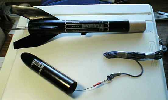 No, the J570 case doesn't fit. ![]() ![]() ![]() ![]() Flying Sleepers The fun thing about flying this type of Big Bertha or any other highly modified Estes rocket is the sleeper effect. When people walk by the table I have set up and check out the rockets they say "Big Bertha, cute - you gonna to fly it on a C motor today?" I say "Nah, there's not much wind so I might try in on an H242". Their eyes bug out as they heft the rocket, it feels very stout to the touch. Always good for a laugh. Walking out to the high power pads is another fun excursion. The people out there setting up their monsters suggest that the low power pads are "over there, close to the LCO table". I say "thanks, but have you seen any 1/4" rods around here?" When launch time finally comes and the LCO gets to this rocket it always looks so teeny sitting waaaay out there with it's larger brothers. Invariably the LCO makes some humorous comment and the crowd chuckles. Once the button gets pushed it's a whole different story.