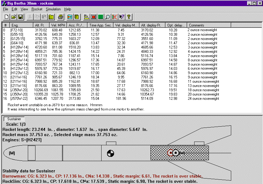 This rocket is safest if sim'd first using a program like RockSim prior to flying. There is a Big Bertha in the RockSim Library that can be used in the process or generate your own. Try it on a 29 mm G64 or G33 Econojet, sim it with the single use H125. With a GLOW of 22 ounces this rocket hits about 7,500 feet on this 22 dollar motor. A lot of bang for the buck, and all you need is the 38 mm to 29 mm adapter. It's about the same with an H154J RMS motor or one of the I RMS motors but you risk losing the case.