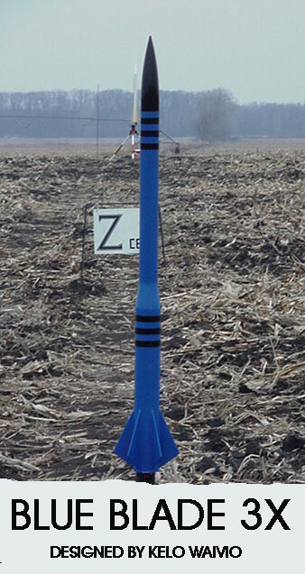 Rocksim gives the Barrowman calculated CP location at 41.59 inches from the nose and the Rocksim calculation CP at 43.35 inches from the nose. I weighed out the 3X at 963 grams less engine. The Blue Blade's Rocksim file can be found in the Rocksim library on the Apogee Components web page.
