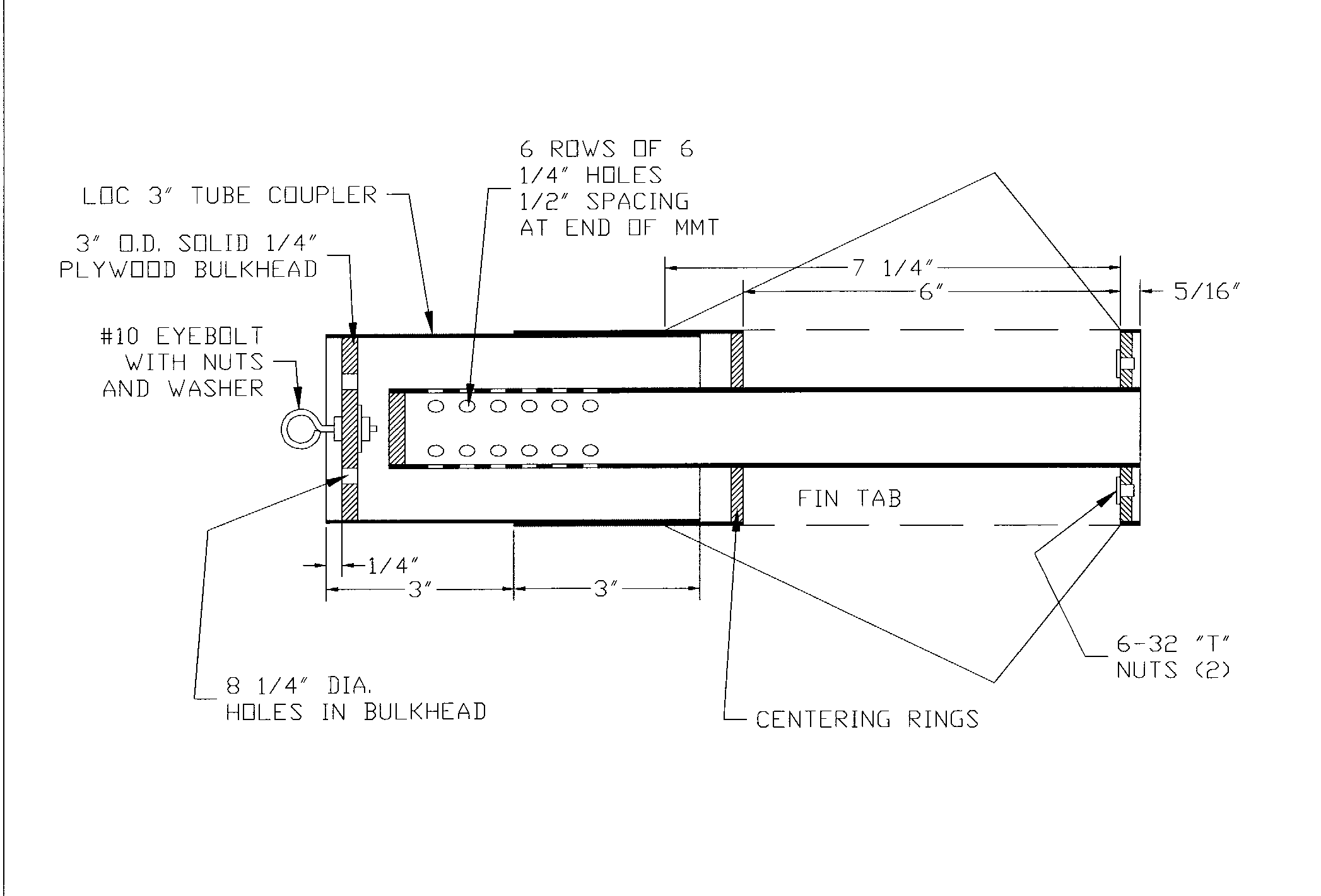 Drill the holes in one centering ring for the "T" nuts and epoxy them in place. Mark the 29mm MMT for the centering rings, the rear at 1/8" from the end the other at 6 5/16" from the end. Make a 29mm/1.14" diameter x *" thick plywood bulkhead plate from some scrap. Coat one end with epoxy then epoxy this into one end of the MMT, coated face toward the motor end. I used a strip of *" wide glass cloth electrical tape and epoxy to reinforce the bulkhead. After the epoxy cures drill the 6 rows of 6 *" diameter holes into the bulkhead end of the MMT. Epoxy the forward centering ring so the back surface is at the 6 5/16" mark.
