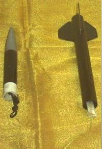 Completion: A launch lug was laminated and finished similar to the tube, using a ¼" launch rod for a mandrel. This was cut to 2" length, and the ends cut at a 45 degree angle. Holes were drilled into one of the fin fillets from the leading edge to 2" aft, and the launch lug epoxied over these. Fillets were then added to the fin/lug joints. The Kevlar cord was tied through the loop in the elastic with a slip knot. The nose cone was sanded with fine grit, washed with soap and water, painted first with white appliance epoxy paint, then aluminum paint, then a coat of acrylic. This was inserted into the forward end of the payload section, and tested for fit, with masking tape being added as necessary to get a tight seal. The entire rocket was then recoated completely with another layer of acrylic for an even finish.