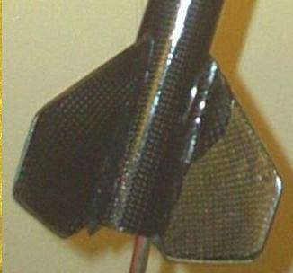 FinsFins: The fins were cut from plywood stock and sanded to a wedge on all edges except the root. These were then inserted into 4" pieces of carbon sleeve, which was pulled tight to fit the edges, and laminated using weight press. When dry, the fins were trimmed, the edges resanded to an edge, except the root which was sanded flat, and finished.