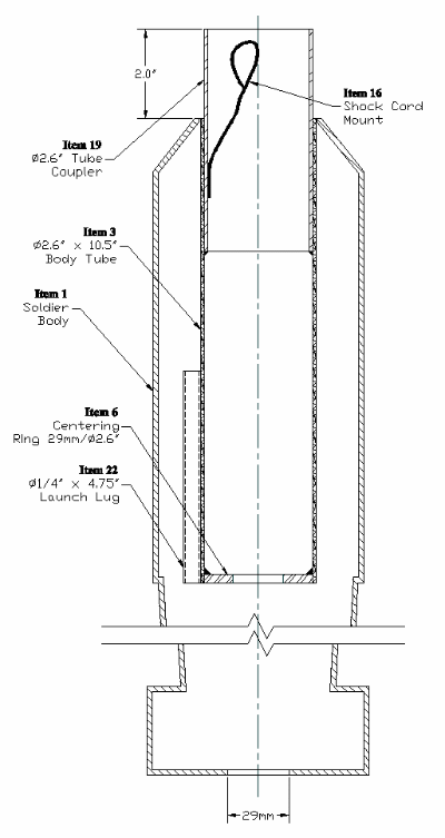 2. Fit the 2.6" body tube (Item 3) into the hole in the top of the soldier body (Item 1) by trimming with a hobby knife and sanding. This fit should be fairly snug as no no adhesive will be used here.