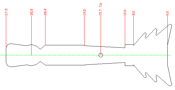 So, to verify that I wasn't going to bury the poor toy soldiers head in the dirt I drew an outline in Auto CAD and found the centroid which is the same as the cardboard cutout Cp. In the process I made a few simplifications which were