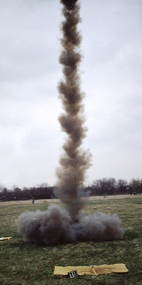 5 ... 4 ... 3 ... 2 ... 1 ... Launch and the Laser Fire igniter immediately sent the Darkstar into overdrive! A roar hit the spectators as the pad was engulfed in thick black smoke. It had to have been the straightest flight of the day and the crowd showed their appreciation with a few cheers as the parachute unfulred right at apogee to bring the FAO Schwartzkopf safely back to earth.