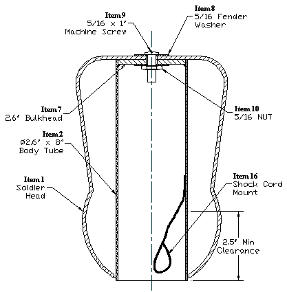 7. Glue the 5/16 nut (Item 10) to one of the Fender Washers (Item 8) with CA and hit with accelerator to completely dry. Place this nut/washer into a socket with a long extension and insert into the head tube. From the outside, insert the Machine Screw (Item 9) through a Fender Washer (Item 8) and tighten assembly together. Check that the Body Tube is centered in the head; if required, adjust the hole in the top of the hat.