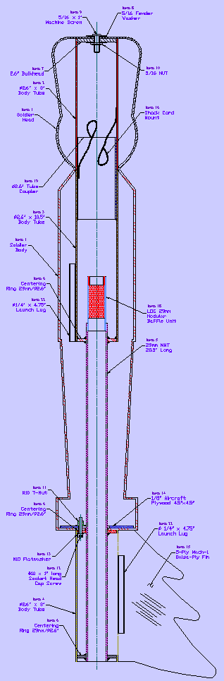 Although the FAO Schwartzkopf is very non-traditional on the outside, inside it is mostly your basic LMR to light HPR construction. The only difference is in the final assembly where the rocketry components are attached to the plastic body of the toy soldier.