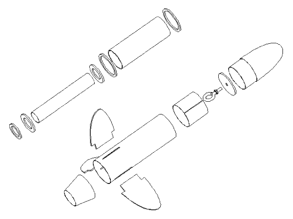 The BT-80 supplied with the kit does not seem likely to withstand repeated applications of 'G' motor thrust, and the forces of high velocity 'chute deployments. Glassing might help, but would also build up the OD of the tube and create a mismatch with the nose cone. In this design, the base of the nose cone shoulder is removed, allowing a heavier internal tube to extend into it, providing additional room to contain the recovery system, improved resistance to zippering, and increased strength.