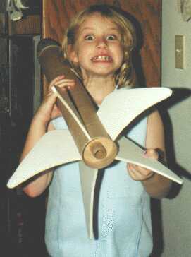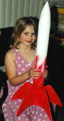 Amanda with the painted rocket Amanda has three previous rockets, but all of them are pretty small. In the fall of 2000 she started asking if it might be possible for her to build a "really big" rocket. I dug in my box of assorted parts and came out with a tube that used to be the core of a roll of butcher paper. It's about the size and thickness of 3" HPR tubing, and was 24" long. I suggested she sit down with paper and pencil and draw me a picture of what she wanted. She proceeded to sketch out some of the most amazing fins I've ever seen, which I thought were angel wings, but which she said were supposed to be fire. She also drew a blunt, maybe 1:1 ogive nose cone which in several drawings gradually grew to about the length we finally made. I wanted to make it a paper cone; she said no way, it had to be curved.