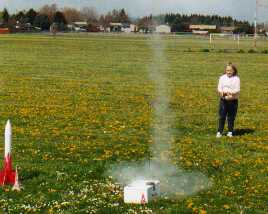 Amanda launches USA while Eyeful and Firebutt waitFirebutt flew on Saturday, April 7, 2001. Sadly, my camera ran out of film before this flight. At 11.9 oz. (336 grams) liftoff weight, it might be better named Leadbutt, but it put in an acceptable low and slow flight on a D12-3. Unfortunately, the parachute hung up in the mouth of the body tube and didn't fully deploy, but it did destabilize the rocket. There was no damage and all is well with the world. At right: Amanda launches her USA on an A10, too quick for the camera, while Firebutt and Eyeful wait.