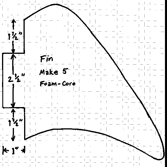 Five fins!Because the grain in balsa wood would have created a weak area no matter how we laid out these fins, they were made from foam-core board instead. For better alignment more than anything else, I added tabs and slotted them in to the motor mount tube. For a pattern, click here. I asked Amanda "three fins or four?" and got the pixie grin and "Can I have five?" After a moment's thought, she got five. I had her mark the front and rear extent of the slots, and then I marked and cut the five slots with an X-acto and angle iron.