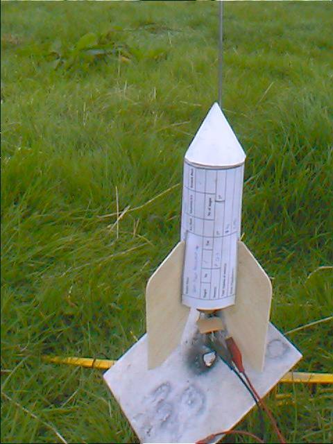 A fabric elastic shock cord was attached to the body and nose-cone using two Estes-style folded paper mounts. A launch lug made from a piece of drinking straw was glued to the body, aligned along and attached to the seam where the form had been glued to make the tube. A good dollop (real precision measurement here - not!) of plasticene in the nose-cone put the CG safely forward, and with a C class motor installed, the rocket passed a swing test. (Bear in mind that this was at a rocketry event, so I did not have access to my computer. In the absence of VCP, I had to resort to the old way of checking stability!)