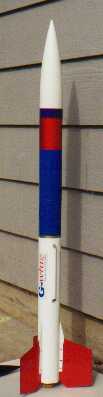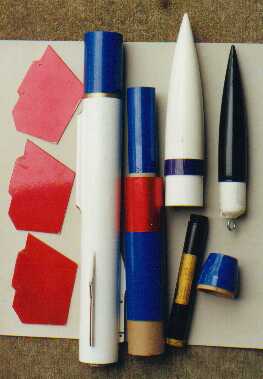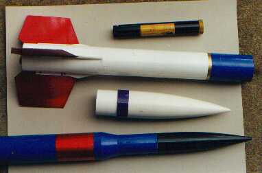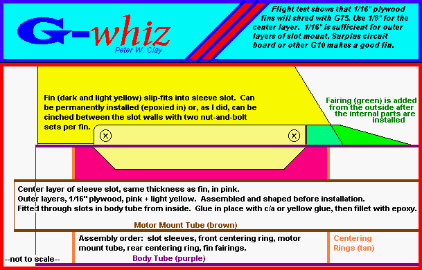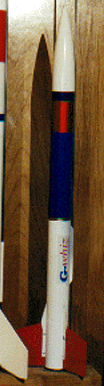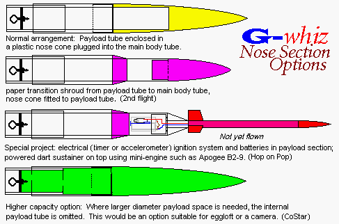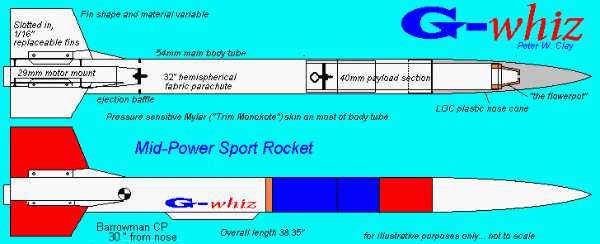 G-whiz Overview: G-whiz is a LMR/MPR/ low end HPR 3FNC/Payload design with one good idea at each end. It was intended to be a testbed for an as-yet unbuilt rocket called I-whish ('cause I wish I could afford to build it now), but two ideas define the design for me: Replaceable fins and a double-wall payload section that extends forward into the hollow plastic nose cone. Being able to replace the fins means: (1) you can change the shape, size, and material, either to experiment, or to suit the payload and motor combination, or just for looks; (2) the rocket packs for storage and transport in a much smaller box; and (3) the fins are anchored to the inside of the body tube; the fin mounting pylon doubles as a gusset for the motor mount, and is epoxied to the MMT, the airframe tube, and the forward and rear centering rings for a rock-solid motor mount. Double-wall payload construction means: (1) A cozy, well-protected environment for electronics or other payload; (2) payload tube extends into hollow nose cone, shifting weight and capacity forward into otherwise wasted space; and (3) adjustable ballast can be placed far forward in the nose cone, requiring less than if it were attached at the base, and safer than if it were cast into the tip. (4) The real reason I did it, though, was to adapt to an electrical staging arrangement in a project I call Hop on Pop -- which, when it flies, will launch a tiny dartlike sustainer powered by an Apogee B2-9. While G-whiz was envisioned for the AeroTech G40-7 motor, it is HPR capable and its first flight was a perfect one with H238T-M(10). G-whiz is not related to the Pratt Hobbies altimeter called G-wiz, though it may someday use one. |