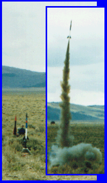Additional Details: (9) Motor Retention: "Kaplow Klips" can be anchored in the T-nuts described earlier, or the motor can be taped to the aft end of the MMT. I have done both on this rocket. (10) Parachute Size RockSim specifies a 34" parachute for this rocket, which will not fit in the recovery bay unless you modify the design by extending the body at least 4" (which will not hurt it, btw). Three flights, however, confirm that a 20" hemi cloth chute is adequate and does fit. (11) Mods, or "what I would do if or when I do it again:" Some are mentioned above. a. Body tube length: Originally both main body and payload were set at 15.25" for no better reason than the rocket, disassembled, would fit in my briefcase. I added 3.5" when it obviously needed more parachute space, giving up the briefcase idea. In hindsight I would have made the main body about 24" long. This will move both the CP and CG forward, but will not hurt the design overall, and would facilitate use of the 29/240 hardware. b. Fin thickness: My fins are 1/16" thick, and only the fiberglass ones are strong enough at that thickness. I suggest in the instructions above making the fin mount cores 1/8" thick. PCB fins would still work with shims. c. Inside bulkhead and shock cord mount: The bulkhead in the prototype was part of a baffle arrangement that did not work. The centered eyebolt works well with my elastic shock cord. However, if I started today I would omit the bulkhead and use a tubular nylon harness with the end epoxied to the inside surface of the coupler before assembly. d. Reinforcement: I would suggest laminating the pylon shells with a layer of 2oz fiberglass before assembly, and also laying a covering of fiberglass over the fin fairings after assembly. In case you wondered: The blue-bordered picture you see at top left is the second flight of Gwhiz, about an hour