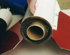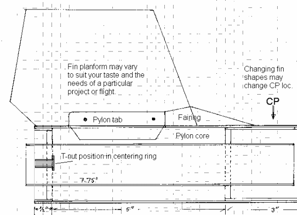 (2) Test Assemble the motor mount and fin canister. Slide the 3" coupler into the tube from the front, centering ring aft. Fit the three pylons through their slots from the inside, sanding the shoulders of the pylons as needed to make them sit squarely in position. Push the coupler down against the pylons from the front. Test-fit the 2.14" i.d. x 7.75" motor mount tube through the pylons to and through the centering ring, and then slip the short coupler and ring assembly over the MMT and into the aft end of the main tube. You want all three pylons to rest against but not dent or damage the MMT. Carve or sand until this is the case. The short coupler should be flush with the aft end of the body tube. Remove everything (except the 3" coupler may be left inside the forward part of the tube; move it several inches out of position). Note and mark which pylon fits which slot; they are unlikely to be identical. Place the aft centering ring assembly (with 1/2" coupler) ring side up. Drill two 1/4" holes in the plywood ring, on opposite sides, so that the holes just touch the cardboard coupler at the outer edge. Test fit the T-nuts, then epoxy them into place from the centering ring side of the assembly. (3) Final assemble the motor mount and fin canister. Put a dab of 5-minute epoxy or yellow glue on the "shoulders" of one pylon and glue it in place from the inside of the tube, aligning it carefully. When it has set, use a dowel or stick to generously spread slow-cure epoxy in the area where the 3" coupler will rest; push it down into position, pausing when it is a half-inch from the pylon. Use the stick to spread epoxy generously on the face of the centering ring, being careful not to get any on the inside surface of the ring; they fit quite tightly as it is. Now push the coupler down against the first installed pylon. Again using the fast-curing epoxy (C/A if you prefer) tack the other two pylons in place. When the fast-cure epoxy is quite tacky but preferably still flexible, install the MMT to the forward centering ring by coating the outside surface of the tube and pushing it in from the rear. Be sure the coupler stays in place against the forward end of the pylons! Hold the MMT in place with the aft centering ring, but do not attach it yet! Push the MMT forward until it projects from the aft end of the body not more than 3/8". Adjust everything for best possible alignment and allow it to cure. Remove the aft centering ring assembly. With a dowel or other stick, fillet the pylons inside the main body and at the MMT. It helps to do one of the three cells at a time. When all fillets are firm, apply epoxy around the inside lip of the body tube and to the aft ends of the pylons; press the aft centering ring assembly in place. Allow to cure.