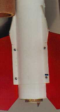 (4) Shock Cord Mount. Note: this describes the system in place in my prototype, which uses braided elastic for the shock cord. If you use tubular nylon it might be better to epoxy the end of it to the inside of the 3" coupler before installing that; in this case, omit the plywood bulkhead. This would have the added advantage of allowing a longer motor casing such as the 29/240. The 2.14" plywood bulkhead disk gets three holes: a 3/16" hole in the center and a 1/2" hole on either side of it. The two larger holes are to pass ejection gas and should be out toward the edges of the disk. One of the eyebolts goes in the center hole. Put a nut on the eyebolt, then the disk, then a washer, then another nut. Coat the nuts, bolt threads, and washer with epoxy and cinch down the nuts on both sides of the bulkhead. Epoxy this to the forward end of the 3" coupler which you installed earlier as part of the motor mount, with the eyebolt facing forward into the recovery bay. Fillet the edges of the bulkhead with slow-cure epoxy. (5) Fin Fairings Sand the leading edge of each fairing assembly round. Test-fit the fins and be sure each fin will sit firmly in one of the pylons. Mark them, if necessary, to assign one particular fin to each pylon. With a fin in place, test-fit a pylon to the front of it. The tabs on the fairing shells should just touch the tabs on the pylon shells. Trim or sand as necessary for best fit. Glue/epoxy the fairings to the BODY TUBE ONLY, not to the fin! You may wish to tape the fairing shell tabs to the pylon tabs while glue dries. When dry, remove the fin and fillet the fairing and fin pylon tabs with a single application of epoxy. At this point I also worked a coat of epoxy into the entire surface of the fairing, especially the leading edge. Allow to cure. Re-install each fin and mark with a pencil where the screw holes will be. Drill slightly larger holes in the fins: I used a 3/32" bit. Now you can test fit the nuts and bolts. (6) Launch Lug Prototype's 1/4" i.d. x 6" long launch lug is centered between two fins but farther forward, with the aft end about 2" forward of the tips of the fin fairings. Since the CP (as drawn) is near the forward tip of the fairings, the rocket will be stable if the balance point (CG) is within the length of the launch lug. If you prefer, you can use two short lengths of launch lug, one at the aft end of the body and the other anywhere forward of the CG. |