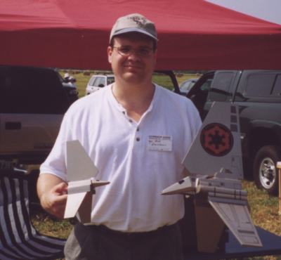 Along the way, I created a proto-type for 18mm motors and was very excited and pleased with the performance of it. Next I finished the 29mm version. You can see me holding both of those rockets at NYPower2002 (photo taken by Dean Oberg).