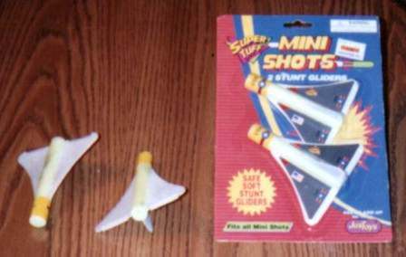 The gliders are called Super Tuff Mini Shots Stunt Gliders. They are made in China for Just Toys, Inc. of New York, NY. They are intended to be used in Mini Shots guns. These appear to be comparable to the Nerf guns that shoot mini darts.