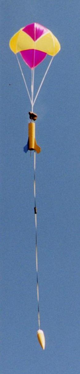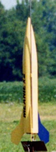 Yes. Weighing in at 6 1/2 pounds, utilizing two 43" JP parachutes with a 20 foot tubular nylon shock cord, and loaded with an H128 (using a 29mm motor adaptor), this bird looked great on the pad. A windy, windy day at Battle Park 1999, however, she was going to fly.