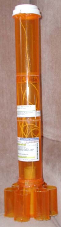 The Lightbulb Goes OnEver since I heard about the RMR DESCON, I've been contemplating entering. Unfortunately, I've only been able to come up with a decent concept once, and I haven't yet had a chance to build it. This time, I was determined to enter, so I spent a couple of weeks trying to think of something creative to use as parts. After seeing the first two entries appear, I was sitting at my desk trying to think of what I could use. I happened to look up at the shelf above the monitor, and the lightbulb finally clicked on! There, right in front of my face, sat the pill bottles for my allergy medication. They're round. They're tube shaped. They're durable. Why won't THOSE work??? A bit more checking around the house I had my hands on a sufficient quantity of parts for this little creation. Next, I had to figure out how to build a motor mount. A check of the bottom of the bottle revealed that the dimpled inner ring in the center of the bottom oft the bottle is close to a perfect fit for a 24mm motor mount. Who needs centering rings when the bottles come with them? Parts ListI'm not certain if all pharmacies label their pill bottles in the same fashion, so I will include not only the size markings from the bottle, but also the approximate measurements.