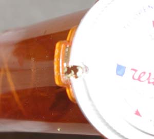 Launch LugWalgreen's pill bottles have a tab on the side, as part of the child-safety cap, which must be pushed down to allow the cap to be removed. I left this tab on the top (nose cone) and bottom bottles, as it is part of the lip of the bottles. I decided to use this tab as a launch lug. On the nose cone, I used a drill to make a hole through the rim of the lid, down through the lid release tab. The hole is large enough to allow a launch rod to pass easily through. I then used the same drill bit to slightly enlarge the opening through the tab in the bottom bottle, in the same fashion. The nose cone is slide onto the coupler and turned such that the launch rod easily slides through the two tabs. |