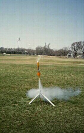 ConstructionThe first problem I encountered was figuring out how to glue the bottles together -- a check of the bottom revealed a recycling code of 5 (polypropylene). Not much adheres to this stuff. Fortunately, the local hardware store had a Loctite product called Plastix. Plastix consists of a small tube of what appears to be regular gel CA and another bottle of "surface activator". Brush the activator on, let it dry, and the CA will adhere to the plastic. Assembling The Body TubeTake the PM-30 with the partial bottom and the PM-60 with the partial bottom and test fit the bottom of the PM-60 into the top of the PM-30. The bottom should fit a short way into the top of the PM-30. Test the motor mount to make sure it fits; sand the openings as necessary to allow the mount to fit without binding. With the motor mount in place, remove the PM-30, leaving it attached to the PM-60. Mark the motor mount where it touches the bottom of the bottle, and remove. Push 12" of kevlar through the motor mount opening, from the top of the PM-60, then insert and glue the motor mount in place. The motor mount will be holding the kevlar in the opening. Next, run the kevlar through the top of the PM-30 with the partial bottom, and through the motor mount opening. Glue the PM-30 in place, with the kevlar coming out the bottom next to the motor mount. Wrap the kevlar around the bottom of the motor mount, against the bottle bottom and glue in place with CA. This will form the firmly anchor the shock cord in place. Invert the PM-30 which is missing its top and bottom onto the top of the PM-60 with the motor mount. Sand as necessary to match the two surfaces and glue into place. Center the coupler ring vertically in the end (now the top of the body tube) of the PM-30 and glue into place. Test fit the bottom of the remaining PM-60 over this ring. The bottle bottom should slide relatively smoothly over the coupler. Some sanding of the coupler may be necessary to allow the motor ejection charge to separate the rocket at this point. Attaching The Nose ConeThe nose section of the rocket is the remaining PM-60, with a cap attached. Use an X-Acto knife or a small drill bit to make a hole just above the bottle lip. The hole should be large enough to allow the kevlar to be pushed throw. Pull enough kevlar through to wrap once around the top of the bottle. Use the surface activator to prepare the thread area on the bottle, then wrap the kevlar around the bottle above the lip and glue it into place. Screw the cap down onto the top of the bottle. Attaching The FinsEvenly glue the six PM-10 bottles around the bottom bottle of the rocket, to create tube fins. |