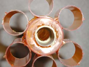 Preparing The BottlesCut the bottoms off all of the smaller (PM-10) bottles. Also cut the lip and threads for the lid off of all six of these bottles. This will provide the tube fins. Take one of the PM-30 bottles and remove a section from the middle of the bottom large enough to allow the motor mount to fit snugly. Set this bottle aside; it will become the bottom section of the body tube. Cut the lip and threads from two of the PM-30 bottles. Remove the bottom of one of the bottles. Cut a 3/4" ring from the top of one bottle and discard the rest. Make a vertical cut in the ring, then remove enough material to allow the piece to fit inside the top of the other bottle. This will become the tube coupler. Cut the bottom out of one of the PM-60 bottles. This is the top of the body tube. Cut the lip and threads from the top of the other PM-60. Cut a hole in the center of the bottom, large enough for the motor mount to fit in. |