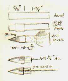 nose cone sketchThe nose cone starts out as a 2" piece of 1/4" maple dowel. Test fit first and cover with a layer of paper if needed to get a good smooth fit; dowels vary quite a bit in size. Then wrap about 3 layers of glue-coated paper to make a shoulder. Chuck this in a power drill and turn it against a sheet of coarse sandpaper to shape; then remove from the drill and cut off the shoulder to about 5/16" long. The overall length of the nose cone should be a bit less than 1". Drill a 1/16" hole at least 3/8" into the base of the nose cone, fill with fresh mixed epoxy and stuff the loose end of the shock cord in.